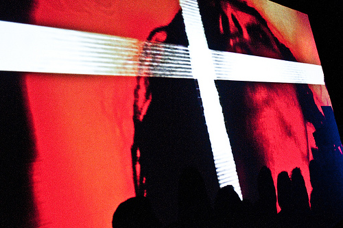 Puis finalement, Alan et P.K. arrive pour le set de mixes de Recoil et surprise, Alan s'avance vers le milieu et la gauche de la scène (leur table de mixage se trouvant sur la droite) et serre les mains du premier rang ! (Je lui arrache la sienne au passage). Côté set, pas de surprise par rapport aux autres dates donc je savais à quoi m'attendre, et je me retrouve ainsi hypnotisée par les projections qui passent devant moi (Recoil, ça s'écoute mais surtout ça se regarde), surtout lorsque Douglas McCarthy de Nitzer Ebb (qui a chanté sur trois morceaux de Recoil dont 2 singles) apparaît sur l'écran. Bien sûr, Alan nous a fait son petit clin d'œil à dM en passant l'Aggro Mix de Never Let Me Down Again qui a provoqué un mini-champ de blé. À la fin, Alan repassera serrer les mains du premier rang.